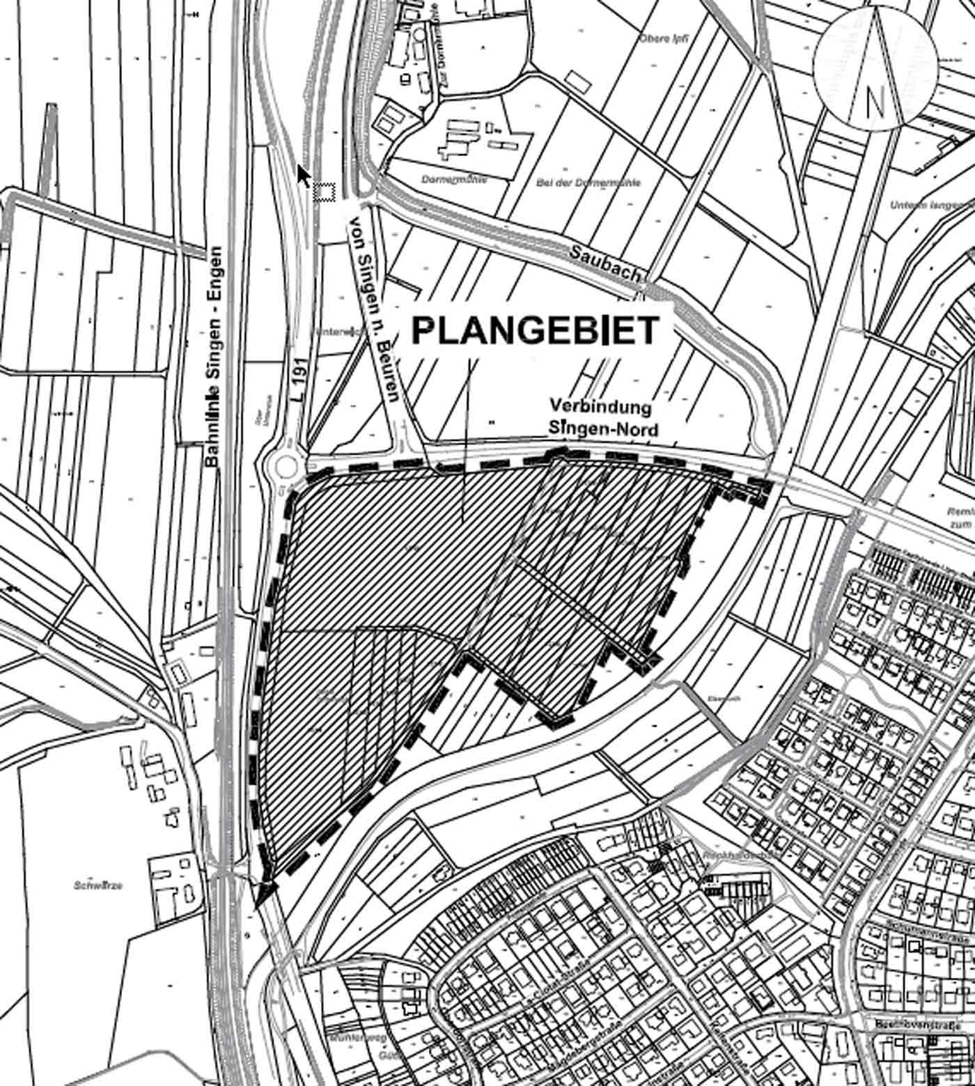 Das Plangebiet liegt südlich der Nordstadtanbindung, wird im Osten und Süden durch die bestehenden Kleingärten westlich der Aach und im Westen durch die L191 begrenzt. Das Plangebiet hat eine Größe von ca. 11,4 Hektar. Die genaue Lage des betroffenen Gebiets kann aus dem beigefügten Übersichtsplan entnommen werden.