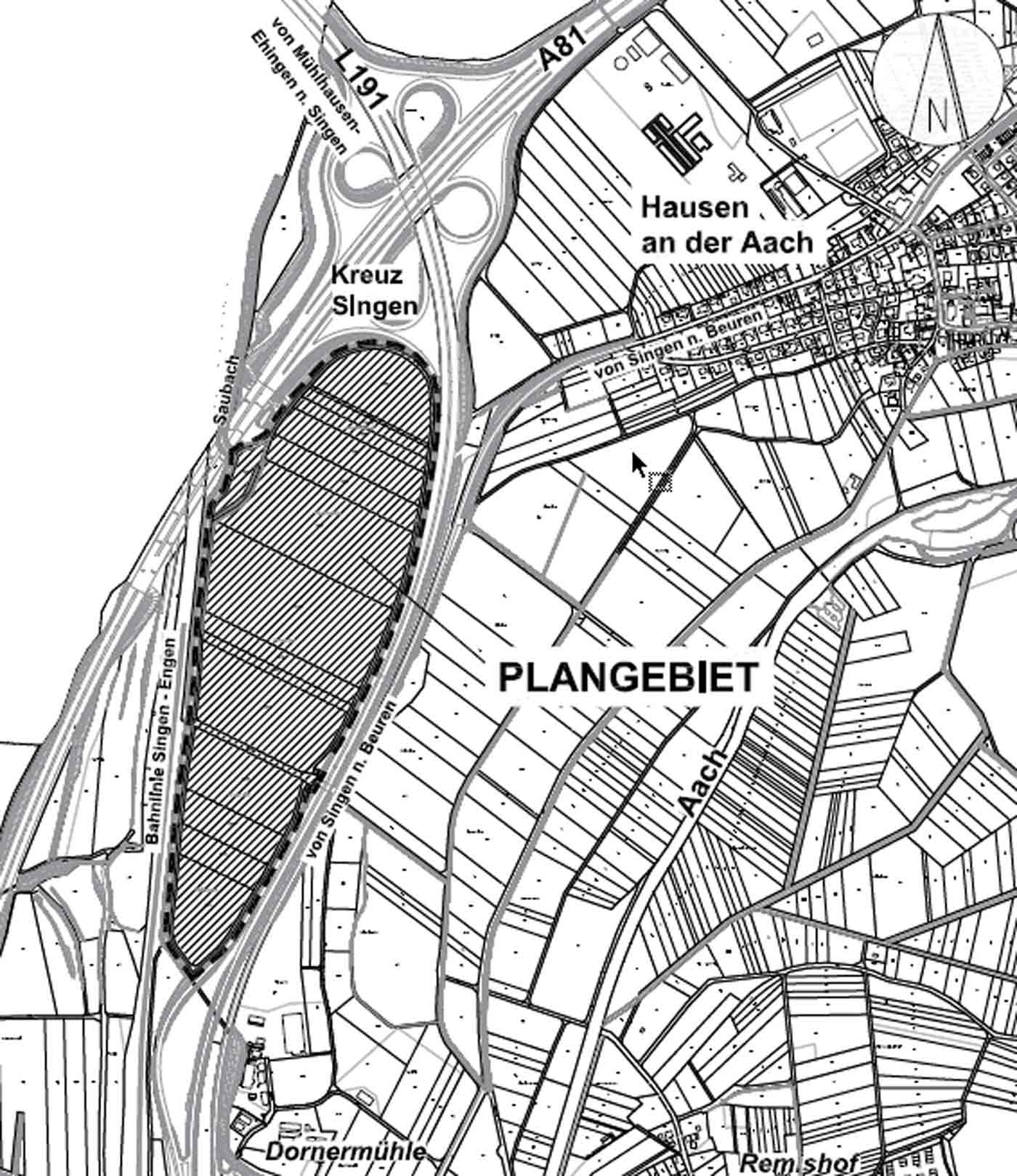 Der aufzustellende Bebauungsplan ist im Norden durch die A81 und die Abbiegespur zur L191 begrenzt, im Osten und Süden durch die L191, im Westen durch den Saubach. Die genaue Lage des betroffenen Gebiets kann aus dem beigefügten Übersichtsplan entnommen werden.