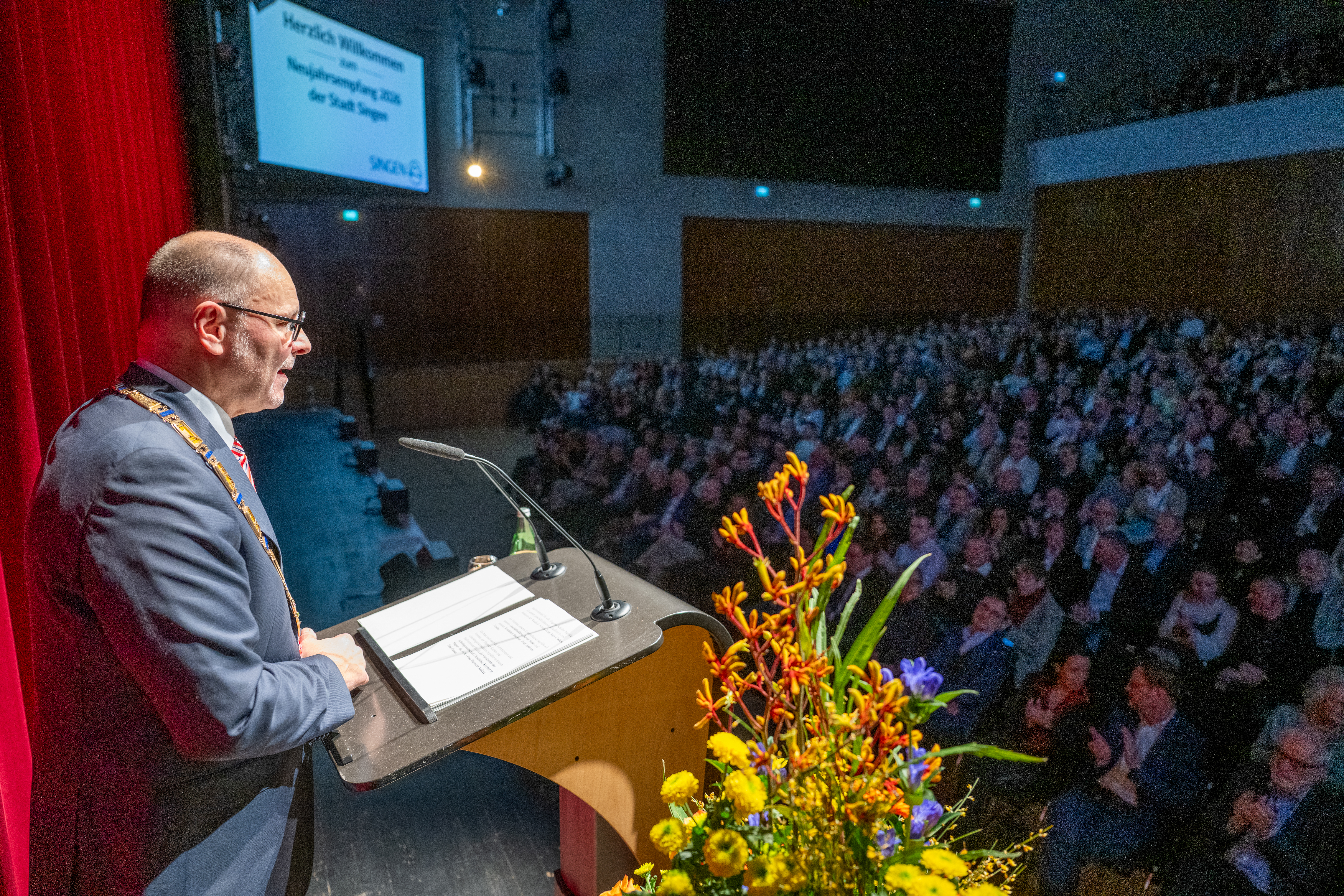 Beim Neujahrsempfang in der voll besetzten Stadthalle kündigte Oberbürgermeister Bernd Häusler an, dass weiterhin in die Zukunft der Stadt Singen investiert werden solle. Aufgrund von Rezession, Stagnation der Wirtschaft, Unsicherheit sowie explodierenden Kosten und zunehmenden Lasten und Aufgaben für die Kommunen befinden sich die Kommunalfinanzen der Stadt wie bei nahezu allen deutschen Kommunen in einer schwierigen Situation. In Singen kamen im Jahr 2024 noch Steuerausfälle von 43 Millionen Euro hinzu. Diese hätten ohne liquide Mittel und eine umsichtige Finanzplanung zur Zahlungsunfähigkeit geführt. „Aber das Geld fehlt”, erklärte der OB.