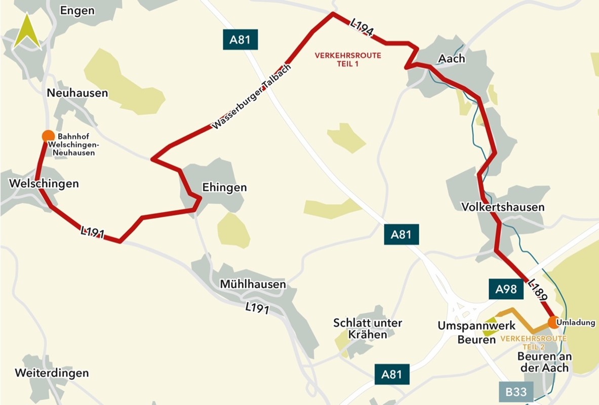 Im Rahmen des Neubaus des Umspannwerks Beuren kommt es aufgrund eines Schwertransports zu temporären nächtlichen Verkehrseinschränkungen: