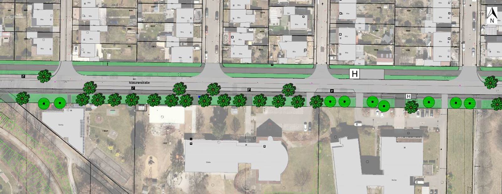 Von einem Energieversorger ist zudem der Ausbau eines Wärmenetzes geplant. Die klimagerechte Straßenraumgestaltung umfasst Grünstreifen, Baumneupflanzungen und versickerungsfähiges Fugenpflaster. Insgesamt sollen in der Masurenstraße rund 3.500 Quadratmeter entsiegelt und neu gestaltet werden. Die hierdurch erzielte Verdunstung und Verschattung kann im Quartier zu einem wirkungsvollen Kühlungseffekt beitragen.