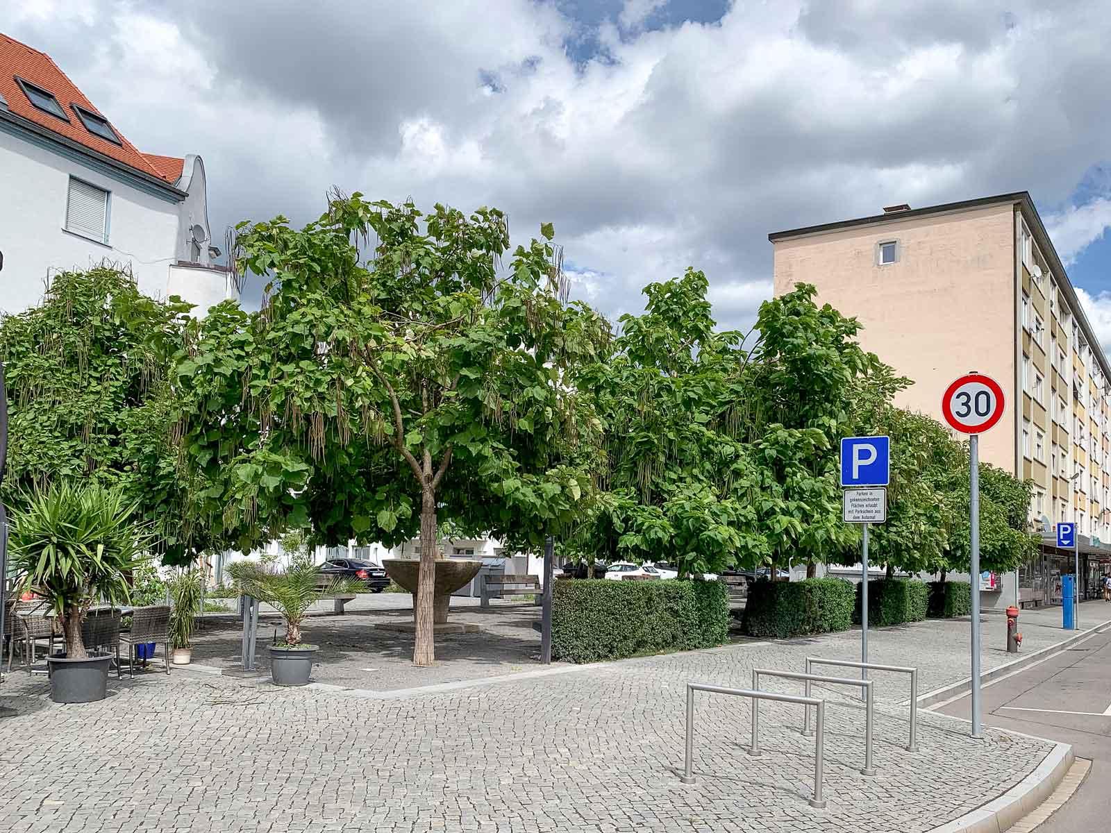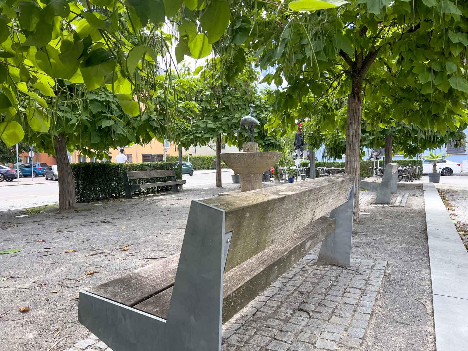 Die für den Platz ausgewählten Trompetenbäume erreichen im Laufe der Jahre eine Höhe von 15 Metern und spenden als innerstädtische Klimaanpassungsmaßnahme im Sommer wertvollen Schatten. Der historische Brunnen, der dem Platz seinen Namen gibt, wurde neu platziert und ist jetzt bis in den öffentlichen Straßenraum hinein präsent. Passend dazu ist die übrige Platzfläche mit Bäumen und Bänken streng symmetrisch gegliedert.